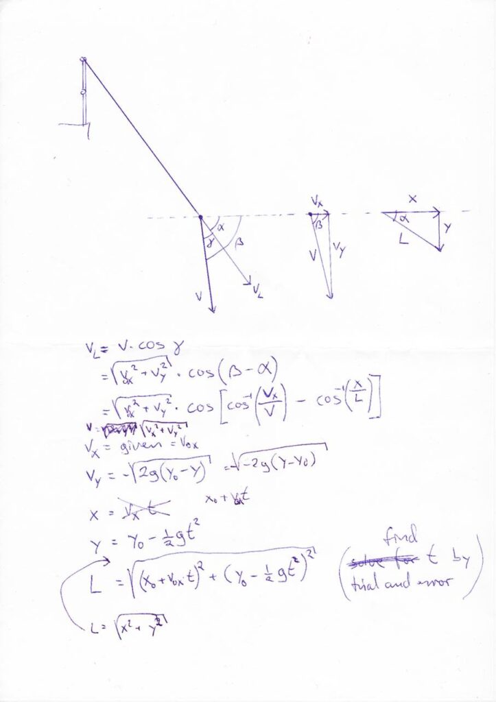 Below is a description of the ‘Hand Rail’ scenario and consideration used for calculating vL.The same calculations are used on all scenarios by changing y0 accordingly. I’ve used 0.2 m for the SL, 1.5 m from SL attachment point on bridle to bottom pin, and 1 m for the rest of the bridle including the length of the top part of the center cell, since this needs to be lifted before starting to load the break cord. This gives a total length of 2.7 m in a straight line between anchor point and parachute, before the break cord is loaded.