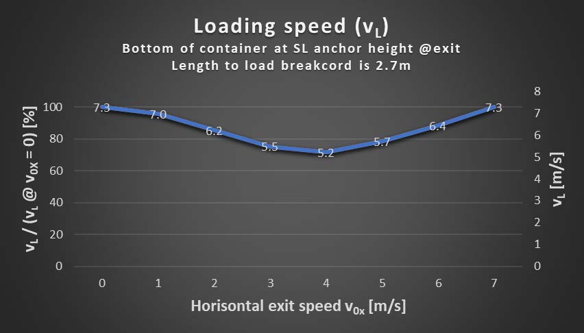 The loading speed is much easier to calculate than the actual force on the break cord since there are so many variables coming into play if attempting to calculate the force on the break cord. The loading speed is a measure that will translate into force on the break cord, and is the same for all setups, therefore it is a good proxy and is sufficient to show the effects of horizontal exit speed. The loading speed is also the basis for calculating the relative loading energy, as we’ll see a bit later.