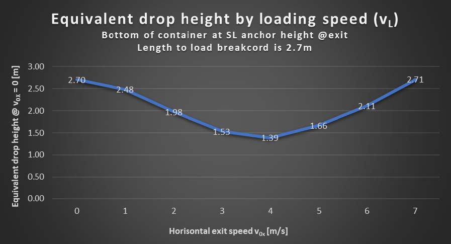 In the plot below we can see that pushing off with a horizontal exit speed of 4 m/s is optimal for minimising the loading speed and thereby also the force on the break cord and that the falling parachute’s loading speed is about 30% less at this horizontal exit speed, compared to dropping straight down.