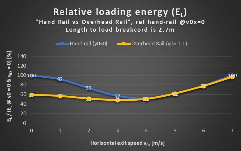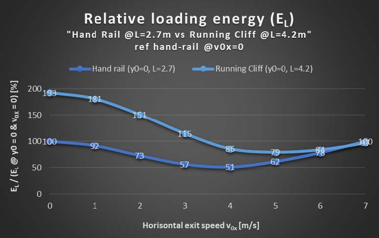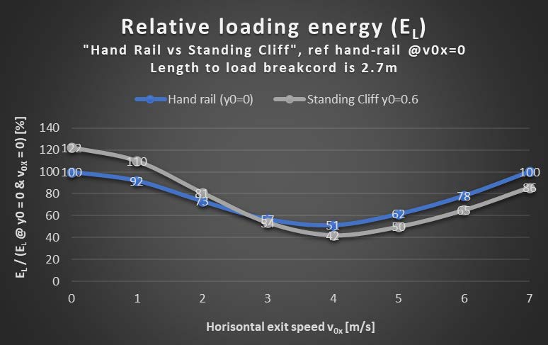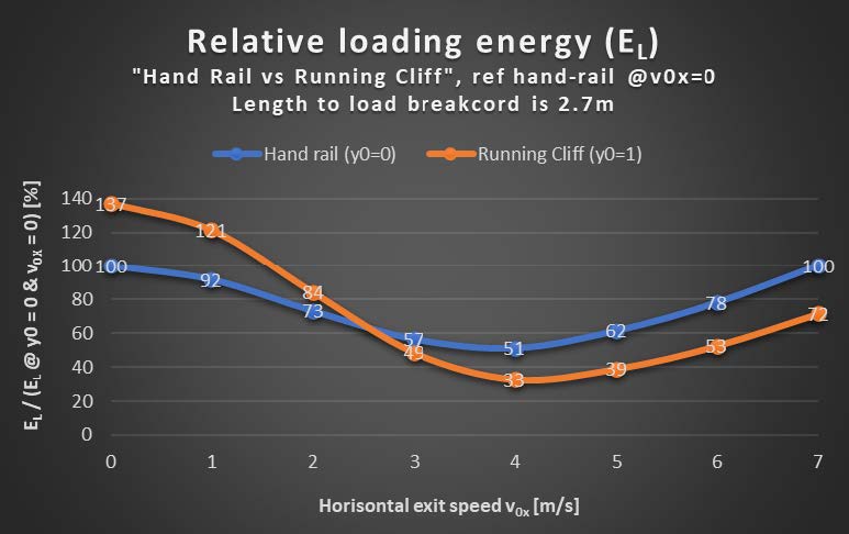 As the anchor point is shifted downwards below the jumper, it is intuitive that if you would fall off straight down, the loading energy would increase. But it is somewhat surprising that running off a cliff at 4 m/s gives less relative loading energy than pushing off with the same speed in the ‘Hand Rail’ scenario, as seen in the plot below.