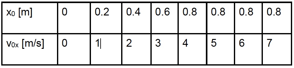 The base data set for the calculations are a set of x0 and v0x pairs, i.e. how far out horizontally you are when gravity starts doing its thing and what horizontal speed you have at that moment. I have used these pairs for all scenarios: