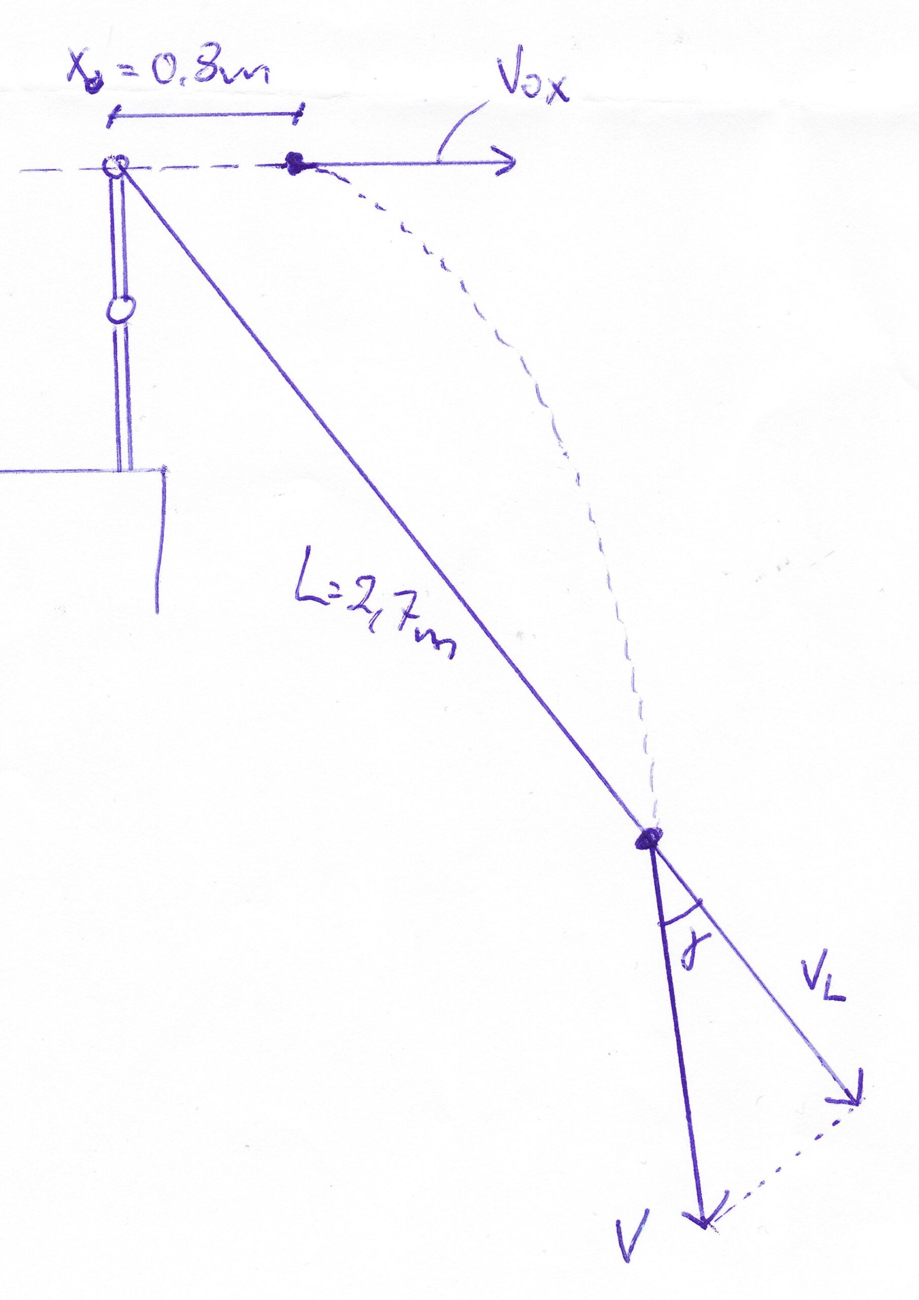 Some time ago I saw a video of a guy doing a running exit on a static line BASE jump and the break cord broke too soon. Luckily there was just enough height. This got me wondering how a running exit, or in general horizontal exit speed, would affect the parachute’s loading speed on the break cord. By loading speed, I mean the component of the parachute’s velocity that is aligned with the static line setup when the static line setup is being loaded, denoted as vL in the diagram below.