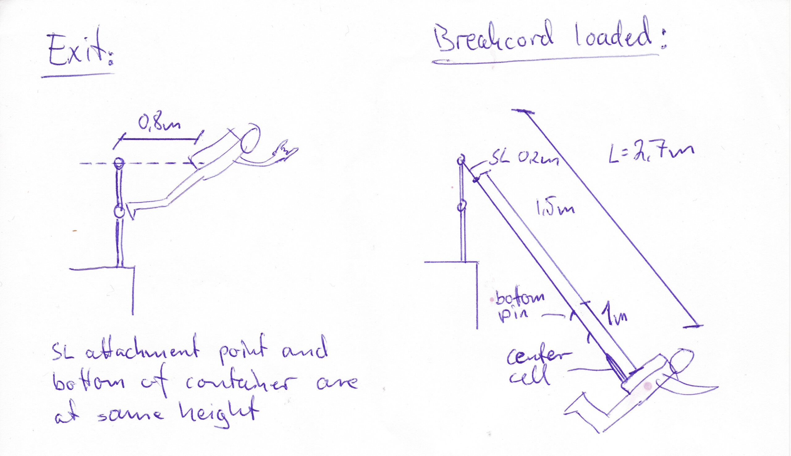 The scenario is jumping from a railing where the bottom of the container is at the same height as the SL anchor point at exit, with the SL attached to the bridle at the midpoint measured from the bottom pin, resulting in L = 2.7 m since also including the slack in the center cell, see diagrams below. Let’s call this the ‘Hand Rail’ scenario.